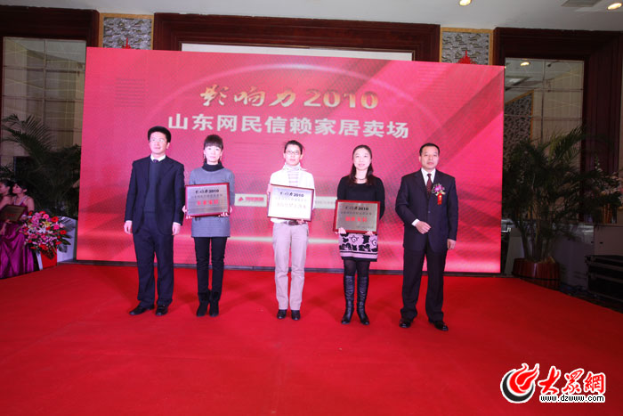 山東省室內(nèi)裝飾協(xié)會(huì)秘書長強(qiáng)健民(右一)、大眾網(wǎng)技術(shù)總監(jiān)李雪修(左一)為獲“山東網(wǎng)民信賴家居賣場”獎(jiǎng)單位頒獎(jiǎng)