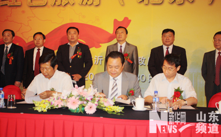 推介會現場,臨沂市旅游局與中國國際旅行社總社、北京神州國際旅行社分別鑒定合作協議。(張譯文 攝)