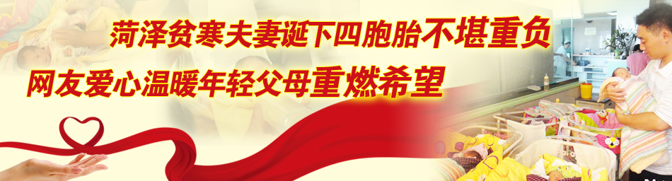 昨天下午,本網報道了菏澤貧寒夫妻誕下四胞胎,無力撫養欲送出一雙兒女的事情,報道發出后,立即引起了社會廣泛關注,國內知名網站紛紛轉...(詳細) |
