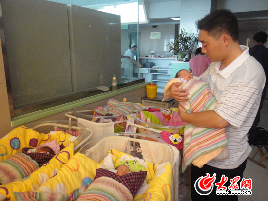 記者見到賈鳳祥時,他剛剛洗完尿布回到孩子身邊。四張嬰兒床里,靜靜地躺著剛剛來到這個世界才5天的四個新生兒,或熟睡或睜開睡眼看看新奇的世界,很是可愛。