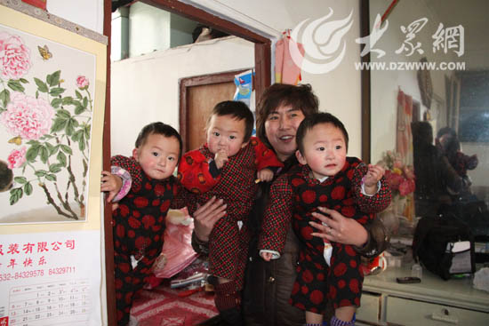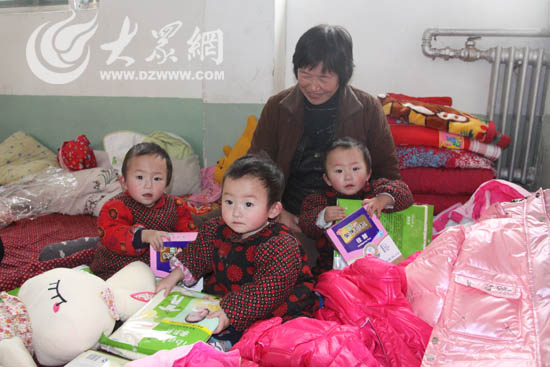 [提要] 去年1月初,大眾網(wǎng)對平度馬戈莊鎮(zhèn)甲流孕婦楊翠翠生下三胞胎女兒后離開人世的消息進行了連續(xù)報道,引起了社會各界和相關(guān)部門的強烈關(guān)注。隨后,大眾幫幫團給三胞胎姐妹贈送了價值近10萬元的生活用品和奶粉,并做出“三年之約”,約定三年內(nèi)持續(xù)幫助三姐妹長大成人。時隔一年,大眾幫幫團再次來到平度市馬戈莊村看望剛滿一周歲的三胞胎姐妹們。