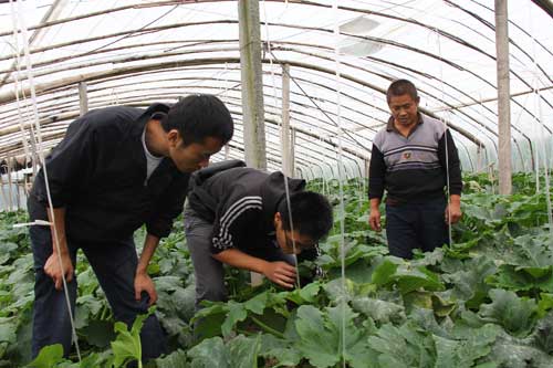 因為現在是蔬菜更替的季節,西葫蘆要到10月份才開始種植,記者一行在泥濘的田間又鉆了兩個大棚,也沒有見到西葫蘆。尋覓良久,記者們終于在李新業的帶領下第一次鉆進了種著西葫蘆的大棚。