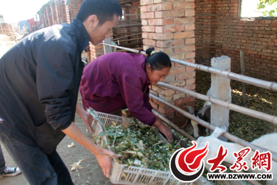 過了一會,葉煥玲拿過一個裝滿青草和玉米秸大盆子,要給羊喂飼料,記者便上前幫助喂羊。一開始,羊害怕生人,就縮回頭去不吃草,不一會又探出頭來吃兩下,記者一伸手又縮回去,結果羊角卡在了柵欄上動彈不得,“撲棱撲棱”掙扎了老半天。