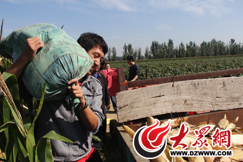 掰棒子是個需要細心的工作,因為要把每一顆玉米桿上結出的玉米都要掰下來,這就需要彎下腰在秸稈密集的玉米地里小心的邊行走邊觀察。起初記者還仔細的看每一個玉米桿,但不一會眼就花了,因為眼前全是綠色,而包著玉米的葉子也是綠色,所以總是不小心漏掉還沒有摘得玉米。不僅這樣,生長玉米的秸稈和葉子蹭在皮膚上會有瘙癢的感覺,用手輕輕一撓皮膚就會紅一大片,很不好受。不過就算這樣,記者幾個人不一會兒就掰了5個麻袋的玉米,記者把盛滿玉米的麻袋拖出玉米地,讓老鄉幫忙扛到肩上,扔到拖拉機的翻斗里。此時雖然已是滿身大汗,但卻真的有種豐收的感覺。