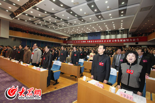 濟南市政協(xié)十二屆四次會議上午9時開幕,委員高唱國歌。