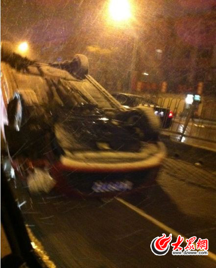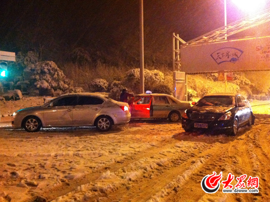 強降雪同樣帶來了市區(qū)道路濕滑、駕駛員視線模糊等問題。記者通過多種途徑了解到,濟(jì)南市區(qū)部分路段發(fā)生數(shù)起嚴(yán)重交通事故。18點左右,在濟(jì)南經(jīng)六路與營市西街交匯處,一輛紅色福特轎車在撞擊馬路中央防護(hù)欄后發(fā)生側(cè)翻,阻礙了該路段道路通行。21點左右,旅游路與千佛山南路交匯處發(fā)生多起交通事故,其中一輛黑色奧迪轎車與黑色尼桑轎車發(fā)生碰撞,事故較為嚴(yán)重,據(jù)目擊者稱,黑色奧迪轎車在與尼桑轎車碰撞后滑行出近千米,車輛前部毀壞嚴(yán)重。