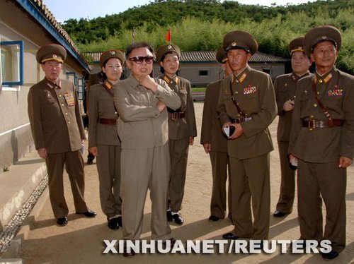 這是朝鮮中央通訊社2008年10月11日公布的朝鮮最高領導人金正日于當日視察朝鮮人民軍821部隊的一支女子炮兵連的照片。 新華社/路透(資料圖)