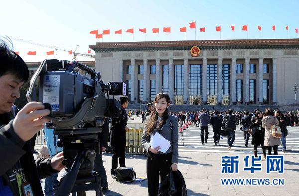 3月3日,記者在人民大會堂前出鏡錄制節目。當日,中國人民政治協商會議第十一屆全國委員會第四次會議在北京人民大會堂開幕。 新華社記者 楊宗友攝