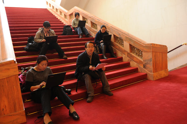 2011年3月3日,全國政協十一屆四次會議在北京人民大會堂開幕。圖為記者在現場發稿。