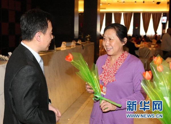 3月8日,北京鐵道大廈的工作人員為參加全國政協十一屆四次會議的女委員和服務兩會的女工作人員獻上鮮花,祝她們節日快樂。新華社發(劉長躍攝)