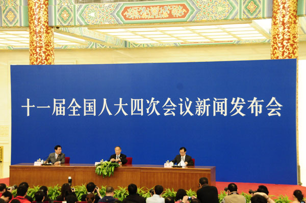 十一屆全國(guó)人大四次會(huì)議于3月4日(星期五)上午11時(shí)在人民大會(huì)堂三層金色大廳舉行新聞發(fā)布會(huì),由大會(huì)發(fā)言人就會(huì)議議程和人大工作相關(guān)的問(wèn)題回答中外記者的提問(wèn)。圖為新聞發(fā)布會(huì)現(xiàn)場(chǎng)。周楠 攝