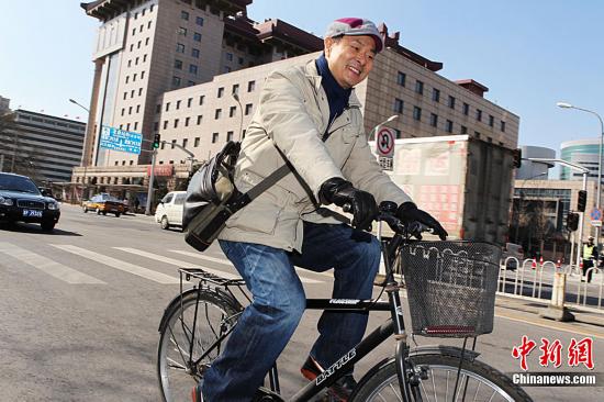 3月2日,全國政協委員、北京人民藝術劇院副院長濮存昕再度騎單車前往全國兩會駐地北京國際飯店報到。去年,他曾以同樣的裝束、騎著同樣的單車報到參會。中新社發 王中舉 攝