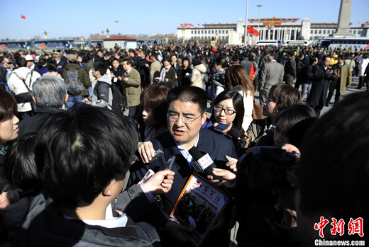 3月3日下午,全國政協十一屆四次會議在北京人民大會堂開幕。圖為大會開幕前,全國政協特邀委員、“中國首善”陳光標被記者包圍采訪。中新社發 劉震 攝