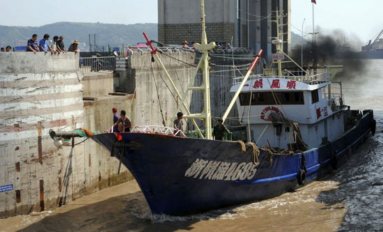 8月4日上午,浙嶺漁4685漁船緩緩駛過浙江臺州溫嶺市東海塘石板殿通航孔,進入避風港躲避臺風“梅花”。該航道泊船區(qū)內(nèi)已經(jīng)有280多艘出海漁船進港避風。