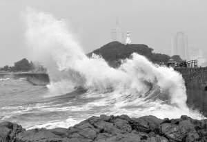 8月7日,受臺風影響,青島小青島景區掀起大浪 新華社發
