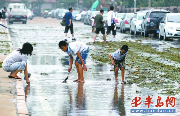 在臺風梅花影響下,大風掀翻了地磚破壞了護欄,對海邊的多個公共設施造成了破壞,但同時大浪也送來了“禮物”,將大海中的海帶卷到岸邊,在澳門路天林花園附近500米的馬路上分布著大量海帶,不少市民和游客冒雨在馬路上尋找“寶貝”,撿海帶給大家帶來了很多樂趣,“這次旅游沒白來,撿這些海帶回家燉排骨!”來自菏澤的游客張女士說。