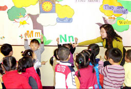 孩子們在老師的指導下學習字母