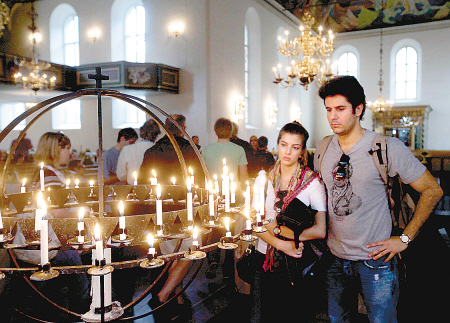 人們在挪威首都奧斯陸大教堂里點燃蠟燭,對襲擊事件中的遇難者表示哀悼。 新華社發(fā)
