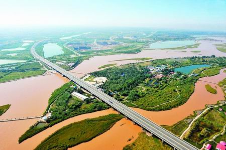 京藏高速公路在吳忠濱河新區穿越黃河,與河心綠洲、濱河大道相映成輝,為“水韻之城”增添了無限的魅力。 (記者 蘇保偉 王玉平 丁建峰 攝)