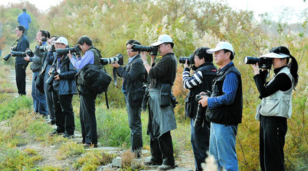 “長槍短炮”瞄準沙湖。 本報記者 蘇保偉 左鳴遠/攝
