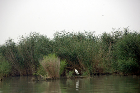 湖水碧波蕩漾,沙海金浪起伏,記者團一行乘船漂過湖面,一蕩一蕩的蘆草在眼前掠過,偶爾游船可以貼近蘆草,用手輕輕地拂過去,手心里就掀起一波柔軟的滑滑的蘆草浪花。初夏,新葦如茂林修竹,郁郁蔥蔥,或如港汊,或如街巷,或如華蓋,或如屏障,微風吹來,綠影搖曳,婀娜多姿。沙與水似天造地設的伴侶,相互偎依,相映成趣,剛柔并濟之中美得沁人心脾。
