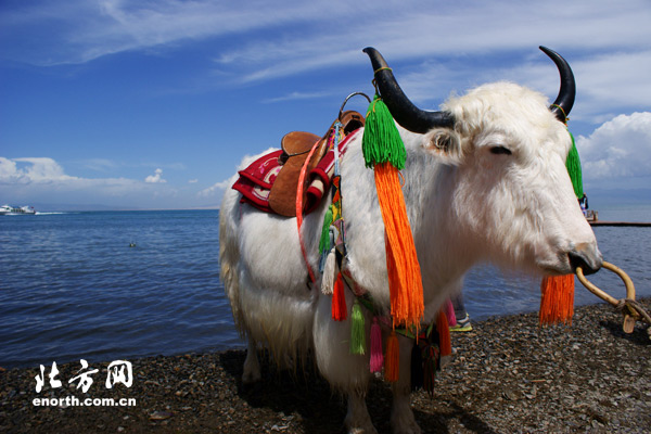 湖邊有牧民帶著雪白的牦牛供游客合影留念