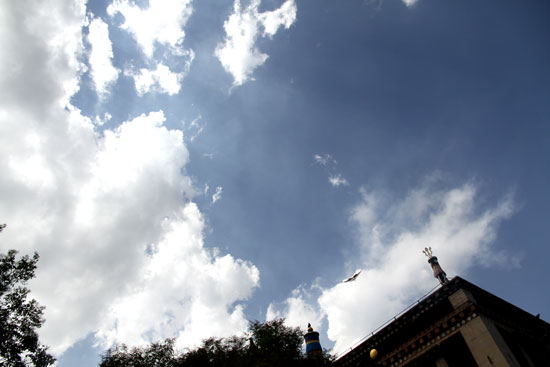 青海湖的天空,海天一色相連。金銀灘的天空,黃色的油菜花映襯湛藍。那都是一種美,可是塔爾寺的天空,蔚藍且高遠。