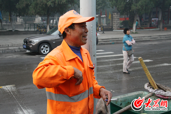 “小伙子,這么早就來了!”遠遠得看到記者走來,陳杰笑著打了個招呼。由于提前聯(lián)系過,陳師傅對記者的到來并不感到意外。記者看到,陳杰身高不足一米七,臉色較為黝黑,雖然已經(jīng)年過50,但身體十分健壯。他穿戴著濟南市環(huán)衛(wèi)工統(tǒng)一配發(fā)的橘紅色環(huán)衛(wèi)服和環(huán)衛(wèi)帽,手里拿著短把掃帚和連著垃圾袋的簸箕,腳上白色的球鞋早已變成黑色。“陳師傅,您也很早啊!”記者話音落下后,陳杰笑著伸出4個手指頭:“每天早晨4點起,4點半開干,雷打不動。”通過交談,記者簡單了解了陳杰的情況。陳杰是濟南市歷城區(qū)人,今年52歲,從事環(huán)衛(wèi)工作已經(jīng)整十年了。記者了解到,陳杰與他的妻子都是環(huán)衛(wèi)工人,兩個人負(fù)責(zé)的是經(jīng)十一路部分路段,清掃面積1700多平方米。由于濟南著名景區(qū)千佛山的正門位于經(jīng)十一路中段,所以該區(qū)域人流量大,清潔任務(wù)重,在國慶與重陽雙節(jié)期間更是如此。