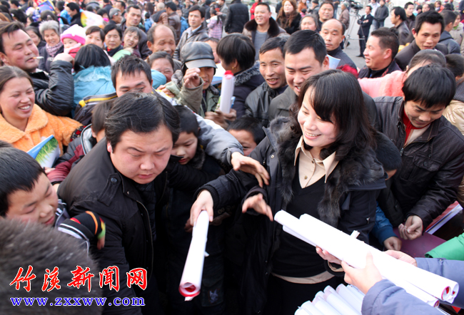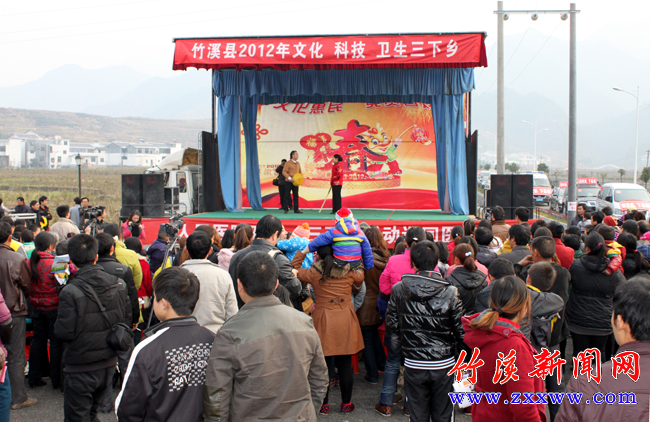 [提要] 9日,竹溪縣舉行以“送歡樂下基層”為主題的2012年“三下鄉(xiāng)”活動,來自文化、科技、衛(wèi)生等方面的100余名工作者走進(jìn)蔣家堰鎮(zhèn)開展文藝演出、免費(fèi)寫春聯(lián)、送年畫、送種子、送藥品、送技術(shù)等活動,為當(dāng)?shù)厝罕娝蛠砹素S富的“文化年貨”。竹溪縣委常委、宣傳部長彭艷,縣人大常委會副主任周元清,縣政協(xié)副主席袁昌順等出席“三下鄉(xiāng)”活動。