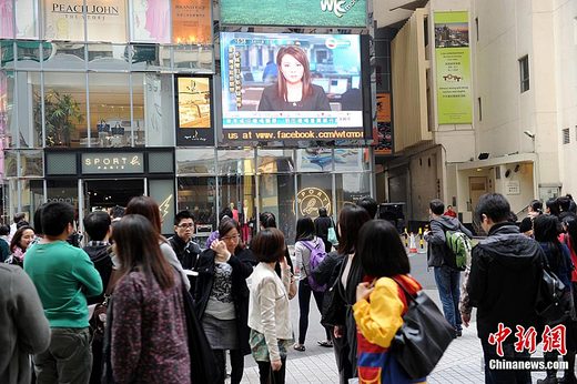 3月11日,日本以東海域發生8.9級強烈地震并引發巨大海嘯,沖毀沿岸建筑物。千葉縣煉油廠爆炸起火。嚴重災情震動香港市民與游客,他們紛紛駐足銅鑼灣世貿廣場的大屏幕電視前,觀看災區實況轉播,平時喧華的鬧市區亦為之凝固。中新社發 鄭祚聲 攝