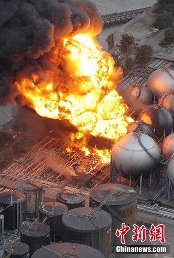 日本近海3月11日發生了強烈地震,首都東京震感強烈。日本氣象廳隨即發布了海嘯警報,稱地震將引發約10米高海嘯。圖為日本千葉縣市原市煉油廠儲油罐發生連環爆炸。