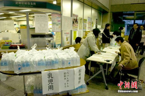 24日,由于東京部分自來(lái)水中檢測(cè)出的放射性碘超過(guò)嬰兒攝取上限,都政府開(kāi)始向有嬰兒家庭發(fā)放共計(jì)24萬(wàn)瓶飲用水。圖為東京都港區(qū)政府向有嬰兒家庭發(fā)放飲用水。中新社發(fā) 孫冉 攝