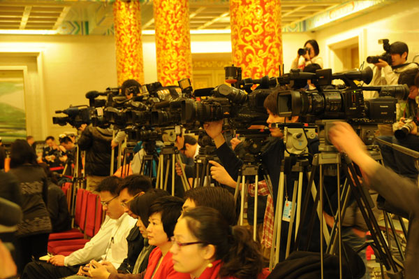 2011年3月4日11時,十一屆全國人大四次會議新聞發布會在人民大會堂三層金色大廳舉行,大會發言人介紹會議情況,并回答記者的提問。圖為新聞發布會前記者們在調試設備。宋君毅 攝