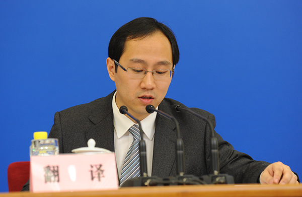2011年3月4日11時,十一屆全國人大四次會議新聞發布會在人民大會堂三層金色大廳舉行,大會發言人介紹會議情況,并回答記者的提問。圖為新聞發布會翻譯。翟子赫 攝