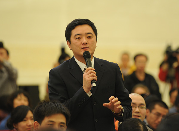 2011年3月4日11時(shí),十一屆全國(guó)人大四次會(huì)議新聞發(fā)布會(huì)在人民大會(huì)堂三層金色大廳舉行,大會(huì)發(fā)言人介紹會(huì)議情況,并回答記者的提問(wèn)。圖為中央電視臺(tái)和中國(guó)網(wǎng)絡(luò)電視臺(tái)記者提問(wèn)。翟子赫 攝