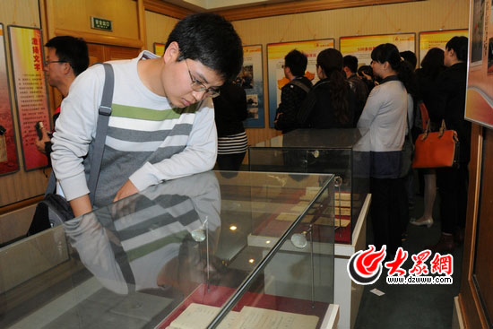 一進入大眾日報報史館,墻壁上的巨幅圖片向記者們展示了大眾日報創刊70多年來受到中央領導的關懷:在大眾日報創刊一周年之際,毛澤東同志題詞;創刊50周年前夕,鄧小平同志題詞,并為大眾日報創辦的第一份生活類報紙齊魯晚報題寫報頭。創刊60周年之際,江澤民同志題詞,勉勵大眾報人,永遠與人民大眾在一起。2003年12月14日,胡錦濤同志在冀魯豫邊區革命紀念館觀看解放前出版的大眾日報。