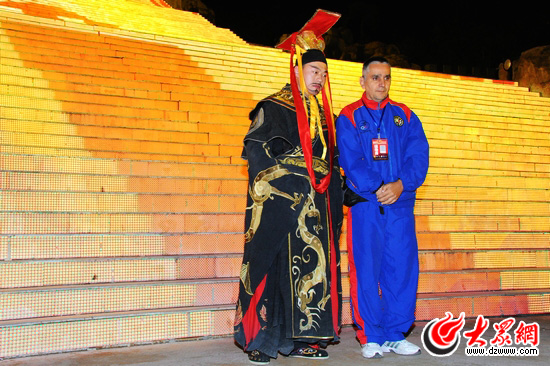 大眾網泰安10月18日訊(記者 馬鑫)“白天登泰山,夜晚觀大典。”這一旅游模式如今已深受眾多來魯游客的喜愛。晚上8點,參加第七屆網絡媒體山東行采訪團的各家媒體記者們來到天燭峰腳下的《中華泰山·封禪大典》實景演出現場,“盤坐泰山下,眼觀千古情”,在高科技燈光音響映襯下和500余名演員完美的演繹中,品味了一場穿越千年中華歷史的視聽盛宴。