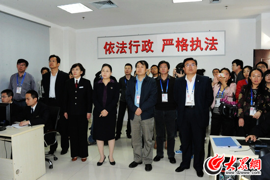 山東省網絡文化辦公室主任劉致福,臨沂市委常委、宣傳部長李建華陪同采訪團考察實時監控程序。(攝影 燕雨)