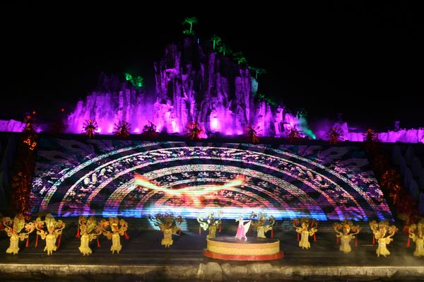 《蒙山沂水》主舞臺(tái)搭建在美麗的沂河湖心島上,東西長(zhǎng)120米,南北寬60余米,舞臺(tái)最高處近30米,主舞臺(tái)及舞臺(tái)前水面占地8000余平方米,可同時(shí)容納觀眾2000余人,兩期工程共計(jì)投資6000余萬(wàn)元。