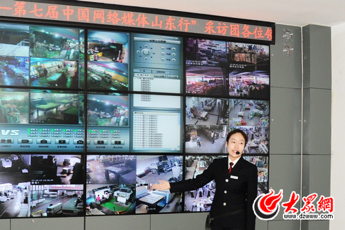 臨沂市文化市場(chǎng)監(jiān)控指揮中心工作人員為采訪團(tuán)介紹實(shí)時(shí)監(jiān)控情況。(攝影 燕雨)