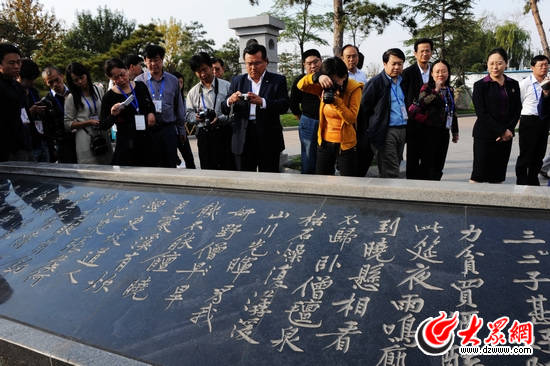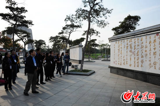 山東網(wǎng)絡(luò)文化辦公室主任劉致福,臨沂市委常委、宣傳部長(zhǎng)李建華陪同采訪團(tuán)參觀臨沂市書(shū)法廣場(chǎng)。(大眾網(wǎng)記者 燕雨 攝)