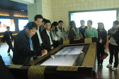 山東省網絡文化辦公室主任劉致福在臨沂規劃展覽館臨摹電子字