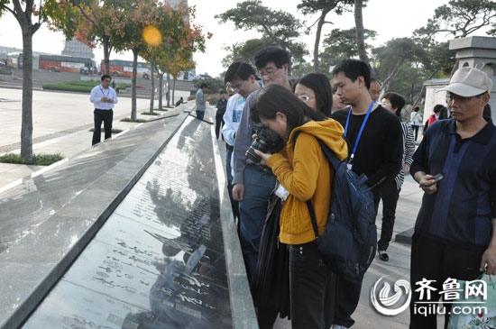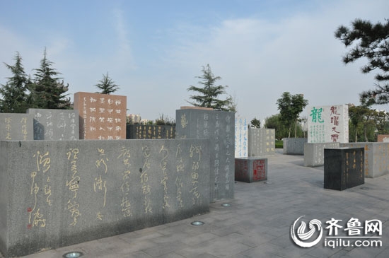 齊魯網10月19日訊 今天下午,第七屆中國網絡媒體山東行的記者來到了臨沂市區著名的書法廣場,感受書法藝術所給予的感官魅力。從王羲之的《蘭亭集序》到蘇軾的《寒食帖》,從古至今、包羅華夏的書法藝術作品系數呈現。各式各樣別具風格的石碑錯落有致的擺放于廣場之內,演繹了自龍山文化陶文字型開始5000余年中國書法文化發展史,充分展示了中國書法博大精深和高深造詣。