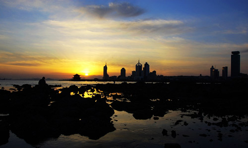 前海棧橋是青島的象征。游人漫步于棧橋海濱,可見青島外形如彎月,棧橋似長虹臥波,回瀾閣熠熠生輝。所謂“長虹遠引”、“飛閣回瀾”所指即此。遠處,小青島如螺,島上樹影婆娑、綠蔭噥噥,一座白燈塔亭亭玉立。灣東側和北側,紅瓦綠樹交相輝映,各式建筑參差錯落的分布在海岬坡地之上。灣西側的現代化高層建筑緊靠海岸拔地而起,壯麗恢宏。沿岸的防波堤由花崗巖壘砌,高出水面10余米。漲潮時,驚濤拍岸,激起簇簇雪白浪花,引來無數游人觀看;潮退后,赭色巖礁和金色沙灘露出水面,海灘上滿是趕海拾貝的游人。近幾年,青島開展了“挽留海鷗”的活動,每逢風平浪靜之時,成千上萬只海鷗在灣內自由翱翔,使美麗的青島灣充滿了勃勃生機。