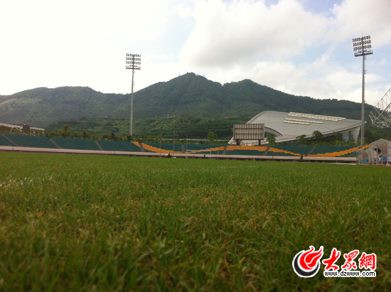 記者站在體育場,只見曲線型的看臺和正曲與反曲相結合的挑棚與筆直、高聳挺拔的拉索立柱形成鮮明的對比,既體現出體育運動優美和流暢的一面,又表達了其力量和剛毅的一面。場內,為了確保天然草皮的健康,工人們正在噴灑農藥。綠色的草坪、紅色跑道、藍色教練座椅、白色的挑棚,各種跳躍的顏色呈現在人們眼前,遠處的群山成為整個體育場的天然背景,使得這個地方被譽為“最美”的體育場。