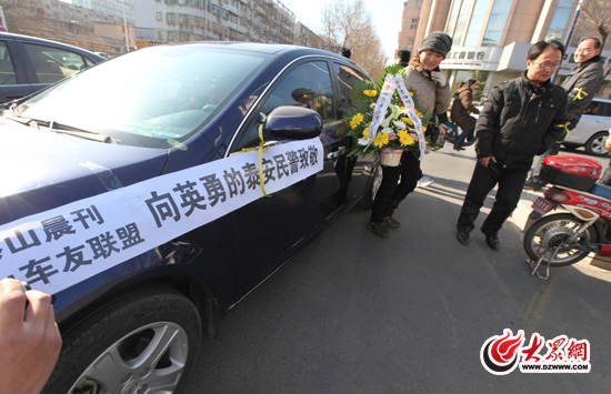“向犧牲的英雄致敬,祝受傷的民警早日康復”,今天下午13時許,一輛輛輕飄黃絲帶的車輛從四面八方向泰安“1.04”案件圍捕現場集結,車友的胳膊上都系著一條條黃絲帶。下車后,他們有秩序的站成一排排,在一位車友誦完簡短的悼詞后,肅立,默哀,鳴笛一分鐘,然后三鞠躬。