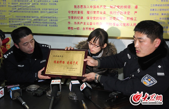 在今天上午的吊唁活動中,來自泰安市泰山區省莊鎮圣元村委會的代表,參加完吊唁后,他們將在兩年前被齊洪海退回的錦旗和牌匾鄭重地交還給了二大隊的民警。在過去三年當中,齊洪海為援建省莊鎮圣元村筑路工程,先后向村委會捐款三次。而村委會為了感謝為村建發展做出貢獻的人員,按規定向村里捐款超出一定份額的人員贈予錦旗和牌匾表示感謝。“可是老齊這個人是個不愛聲張、不愛說話的老實人”,村委會先后征求他意見并贈予他錦旗和牌匾都被他退回了。無奈之下,村委會只能把這兩樣東西保存在了村委會。直到今天,村委會才可鄭重的交還給二大隊。