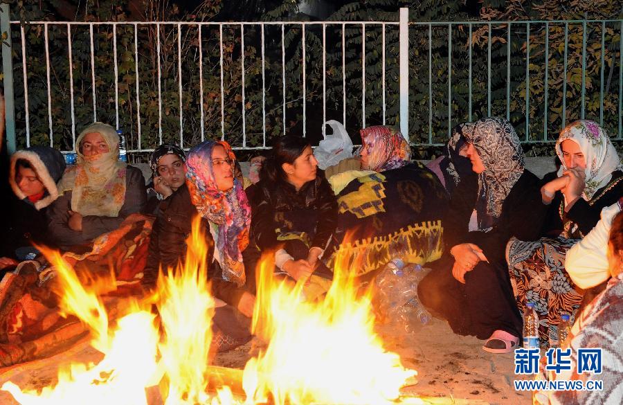 10月23日,在土耳其東部凡省地震災區,當地居民坐在火堆旁取暖。土耳其伊斯坦布爾地震研究中心已將凡省當天發生的地震級別由先前公布的里氏6.6級上調為里氏7.2級,并估計此次地震可能造成數百人死亡。新華社/阿納多盧通訊社