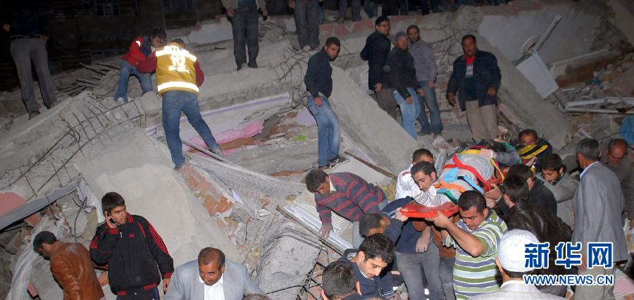 10月23日,在土耳其東部凡省地震災(zāi)區(qū),當(dāng)?shù)鼐用駨膹U墟中救出一名傷員。土耳其總理埃爾多安23日說(shuō),到目前為止,土耳其東部凡省發(fā)生的強(qiáng)烈地震已經(jīng)造成138人死亡、350人受傷。新華社/阿納多盧通訊社