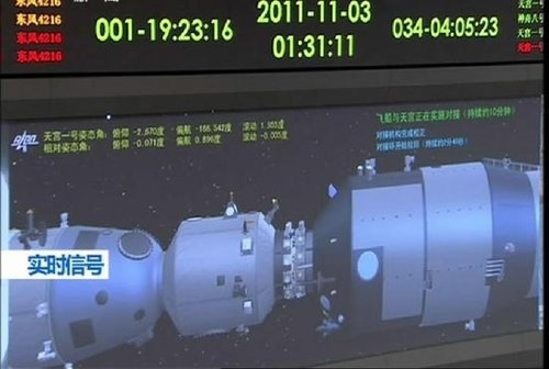 1時(shí)36分,擴(kuò)音器里傳來(lái):“天宮一號(hào)、神舟八號(hào)對(duì)接機(jī)構(gòu)鎖緊,轉(zhuǎn)組合體飛行,交會(huì)對(duì)接完成!”